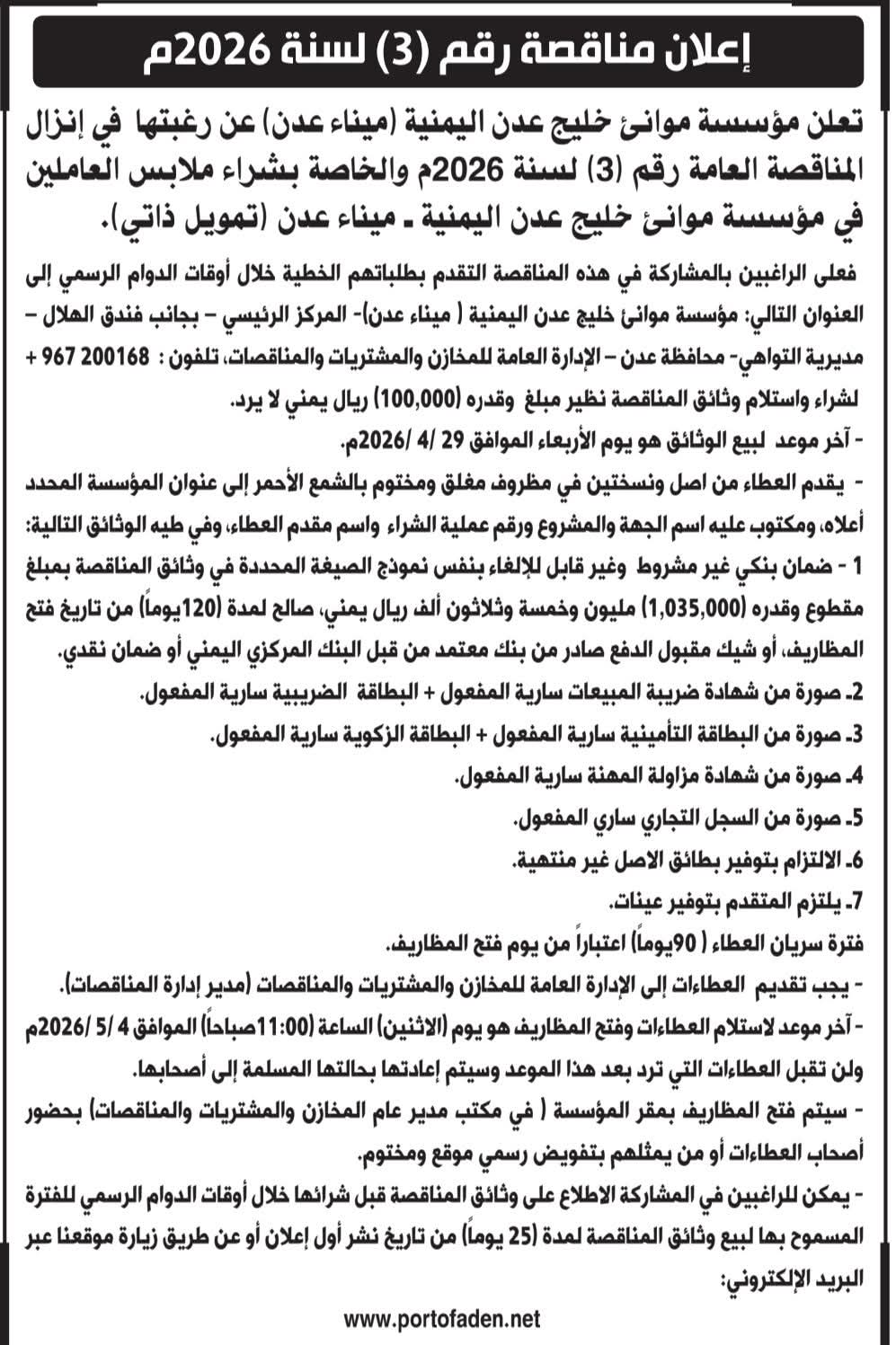 تعلن مؤسسة موانئ خليج عدن اليمنية (ميناء عدن) عن رغبتها في في إنزال المناقصة العامة رقم (3) لعام 2026م والخاصة بشراء ملابس للعاملين في المؤسسة للإطلاع .على تفاصيل المناقصة نرجو تحميل الملف المرفق ...